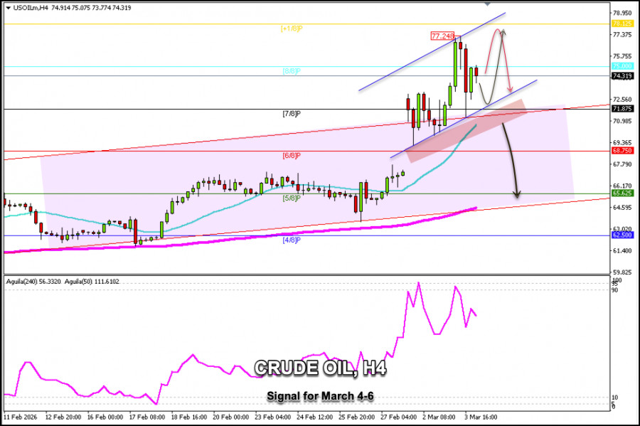 Vzhledem k tomu, že ropa (WTI) prolomila kanál vzestupného trendu a nachází se nad 7/8 Murray, v následujících hodinách se očekává obnovení vzestupného cyklu, přičemž cena by mohla dosáhnout až 78,19 USD.