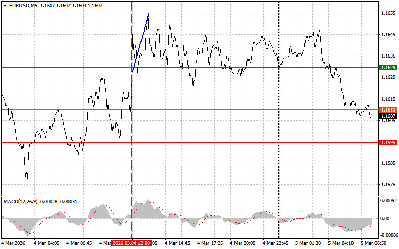 Тест цены 1.1629 пришелся на момент, когда индикатор MACD только начинал движение вверх от нулевой отметки, что стало подтверждением правильной точки входа на покупку евро. В результате пара выросла на 25 пунктов.
