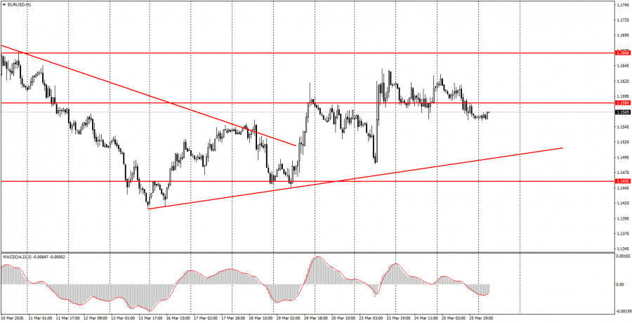 Валютная пара EUR/USD в течение среды вновь не показала никаких интересных движений. Макроэкономический фон в течение дня отсутствовал, выступление Кристин Лагард ничего не дало трейдерам, а новостей обнадеживающих или эскалационных с Ближнего Востока не поступало. Все, что мы узнали в течение дня – это отказ Ирана от каких-либо переговоров с США, а также подготовку США(несмотря на более ранние заявления Трампа) к наземной операции в Иране. Таким образом, на данный момент можно с уверенностью сказать, что ни о какой деэскалации на Ближнем Востоке в ближайшее время речи не идет. Если Трамп начнет наземную операцию в Иране, это еще больше усугубит текущее положение вещей на рынках энергоносителей. Инфляция потенциально вырастет еще сильнее по всему миру, а доллар может вновь перейти в рост, как защитный актив. Поэтому в данное время наземная операция может спровоцировать новое падение пары EUR/USD. В техническом плане восходящая тенденция на часовом ТФ пока сохраняется.