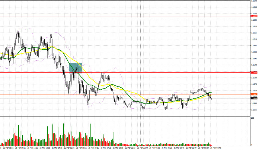 Вчера была образована лишь одна точка входа в рынок. Давайте посмотрим на 5-минутный график и разберемся с тем, что там произошло. В своем утреннем прогнозе я обращал внимание на уровень 1.1628 и планировал от него принимать решения по входу в рынок. Рост в район 1.1628 произошел, но теста этого уровня так и не состоялось, так что я остался без сделок. Во второй половине дня прорыв и обратный тест 1.1584 привели к продажам евро, что вылилось в падение пары более чем на 30 пунктов.