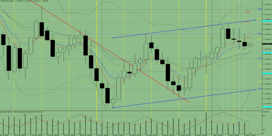 Alternativní scénář: Od úrovně 1,1625 (uzavření včerejší denní svíčky) by cena mohla zahájit vzestupný pohyb směrem k 1,1640 – úrovni 38,2 % retracementu (žlutá přerušovaná čára). Při testování této úrovně by cena mohla znovu klesnout na historickou úroveň supportu kolem 1,1608 (světle modrá přerušovaná čára).