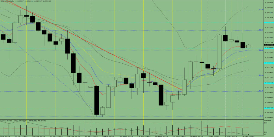 Alternativní scénář: Ve středu by se trh mohl od úrovně 1,3293 (uzavření včerejší denní svíčky) začít pohybovat směrem nahoru k 1,3355 – horní fraktál (denní svíčka z 9. prosince 2025). Při testování této úrovně by cena mohla znovu klesnout na úroveň 1,3345 – horní fraktál (denní svíčka z 8. prosince 2025).
