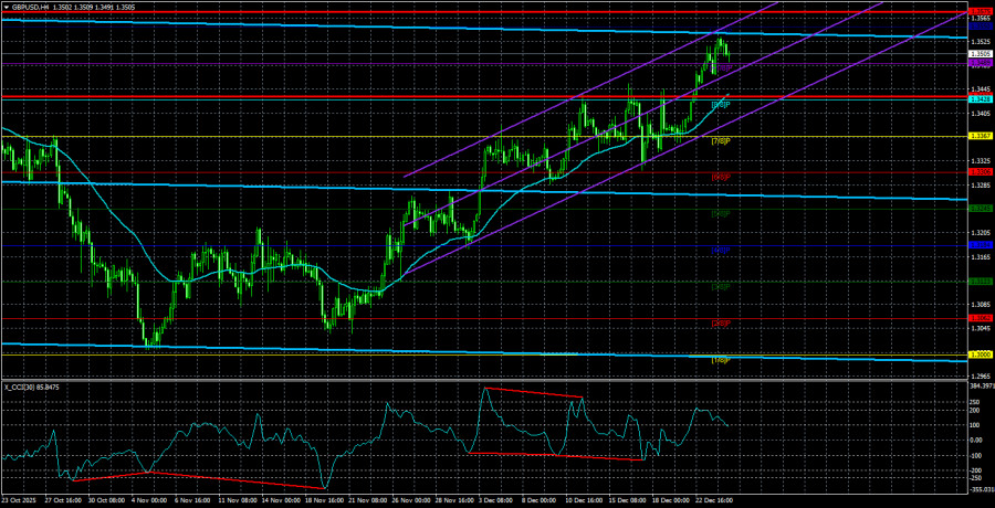 Средняя волатильность пары GBP/USD за последние 5 торговых дней составляет 71 пункт. Для пары фунт/доллар это значение является «средним». В пятницу, 26 декабря, таким образом, мы ожидаем движения внутри диапазона, ограниченного уровнями 1,3433 и 1,3575. Старший канал линейной регрессии направлен вниз, но только из-за технической коррекции на старших ТФ. Индикатор CCI шесть раз заходил в область перепроданности за последние месяцы и сформировал множество «бычьих» дивергенций, что постоянно предупреждает о возобновлении восходящего тренда. На прошлой неделе индикатор сформировал еще одну «бычью» дивергенцию, что вновь предупреждает о возобновлении роста.