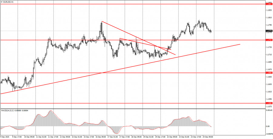 Валютная пара EUR/USD в среду показала минимальное движение вниз пунктов на 20-30. Волатильность практически отсутствовала, так как рынок вовсю готовился к Рождеству, а макроэкономический или фундаментальный фон отсутствовал. Сегодня рынок закрыт, и откроется он лишь завтра утром для того, чтобы поработать один день. Можно сказать, что праздники начались, поэтому выходных будет больше, чем обычно, а волатильность может быть ультра-низкой в эти дни. Если же рынок все же найдет какие-то основания для торговли, то спрогнозировать возможные движения можно будет только по техническим факторам. К примеру, сейчас сохраняется восходящая тенденция на часовом ТФ, поэтому сигналы на покупку более актуальны для отработки.