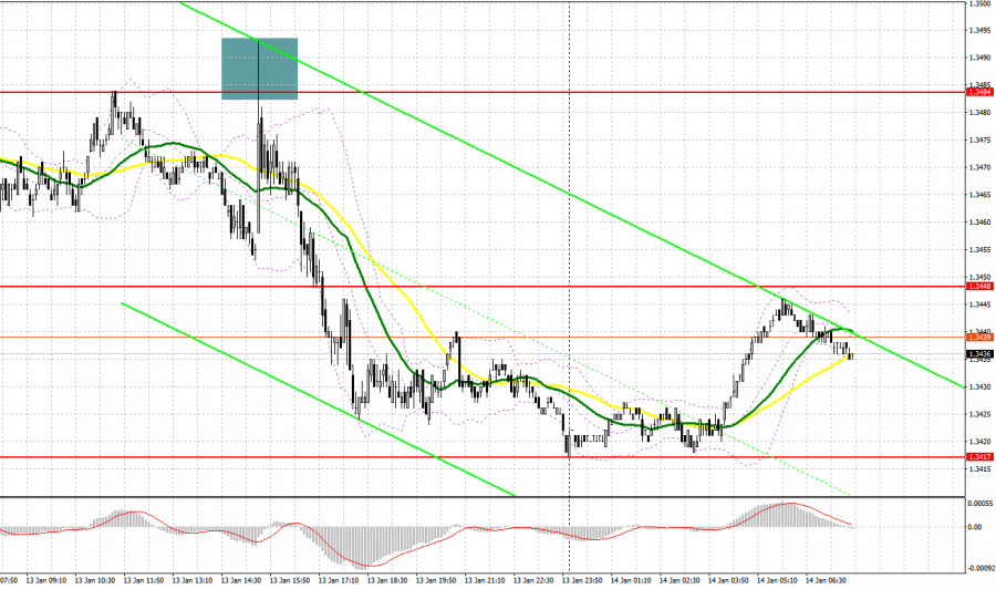 Инфляции в США в декабре прошлого года выросла на 0,3%, оказавшись выше прогнозов экономистов, что привело к ослаблению фунта и укреплению американского доллара. Данные стали убедительным аргументом того, что Федеральная резервная система в ближайшее время точно не будет снижать процентные ставки. Сегодня ожидается лишь выступление члена КМП Банка Англии Алана Тейлора. Учитывая, что даже вчерашнее речь Бэйли не помогла с ростом фунту, на Тайлора рассчитывать сильно не приходится. В случае возврата давления на пару рассчитывать быкам можно будет на ближайшую поддержку 1.3417, образованную по итогам вчерашнего дня. Лишь формирование там ложного пробоя станет хорошим вариантом для открытия длинных позиций с целью роста к сопротивлению 1.3452. Прорыв и обратный тест сверху-вниз этого диапазона вернут шансы на укрепление GBP/USD, что приведет к сносу стоп-приказов продавцов и подходящей точке входа в длинные позиции с возможностью выхода к 1.3484, где ожидаю уже более активного проявления медведей. Самой дальней целью будет область 1.3514, где собираюсь фиксировать прибыль. При сценарии снижения GBP/USD и отсутствия активности со стороны покупателей на 1.3417, давление на пару только увеличится, что приведет к движению в район следующей поддержки 1.3392. Лишь формирование там ложного пробоя будет подходящим условием на открытие длинных позиций. Покупать GBP/USD сразу на отскок собираюсь от минимума 1.3370 с целью коррекции в 30-35 пунктов внутри дня.