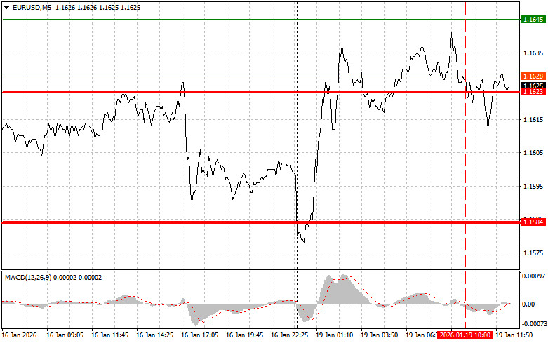Dnes plánujem predať euro, keď dosiahne úroveň 1,1611 (červená čiara na grafe). Cieľ bude na úrovni 1,1584, kde ukončím predaj, a otvorím nákupné pozície v opačnom smere, pričom počítam s pohybom vo veľkosti 20 ‒ 25 pipov od tejto úrovne. Tlak na pár sa dnes obnoví, ak Trump upustí od plánu získať Grónsko a zaviesť obchodné clá. Dôležité: pred predajom sa uistite, že indikátor MACD sa nachádza pod nulovou hodnotou a práve od nej začína klesať.
