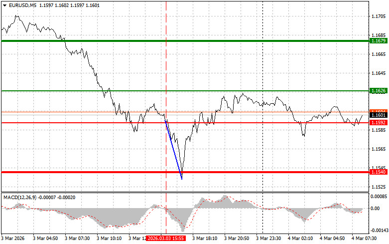 Cena otestovala úroveň 1,1592, keď indikátor MACD začal klesať z nuly, čo bolo potvrdením, že táto úroveň je vhodným vstupným bodom na predaj eura. V dôsledku toho pár klesol cieľovú úroveň 1,1540.